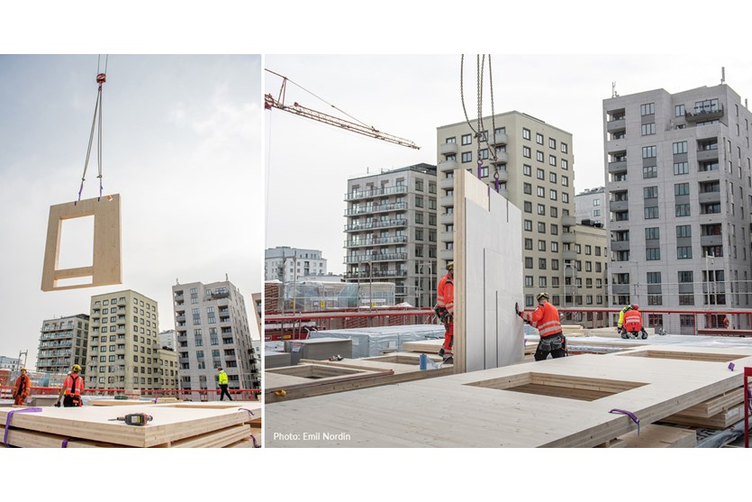All the components for the apartment block’s structural frame are being fabricated in glulam and cross-laminated timber at Setra’s factory in Långshyttan, in southern Dalarna. The entire production process is meticulously planned to ensure that the finished components – walls, shafts and floors – are produced, packaged and supplied in the right order. This then means that assembly on site is quick and efficient, with the building growing by around one storey per week.